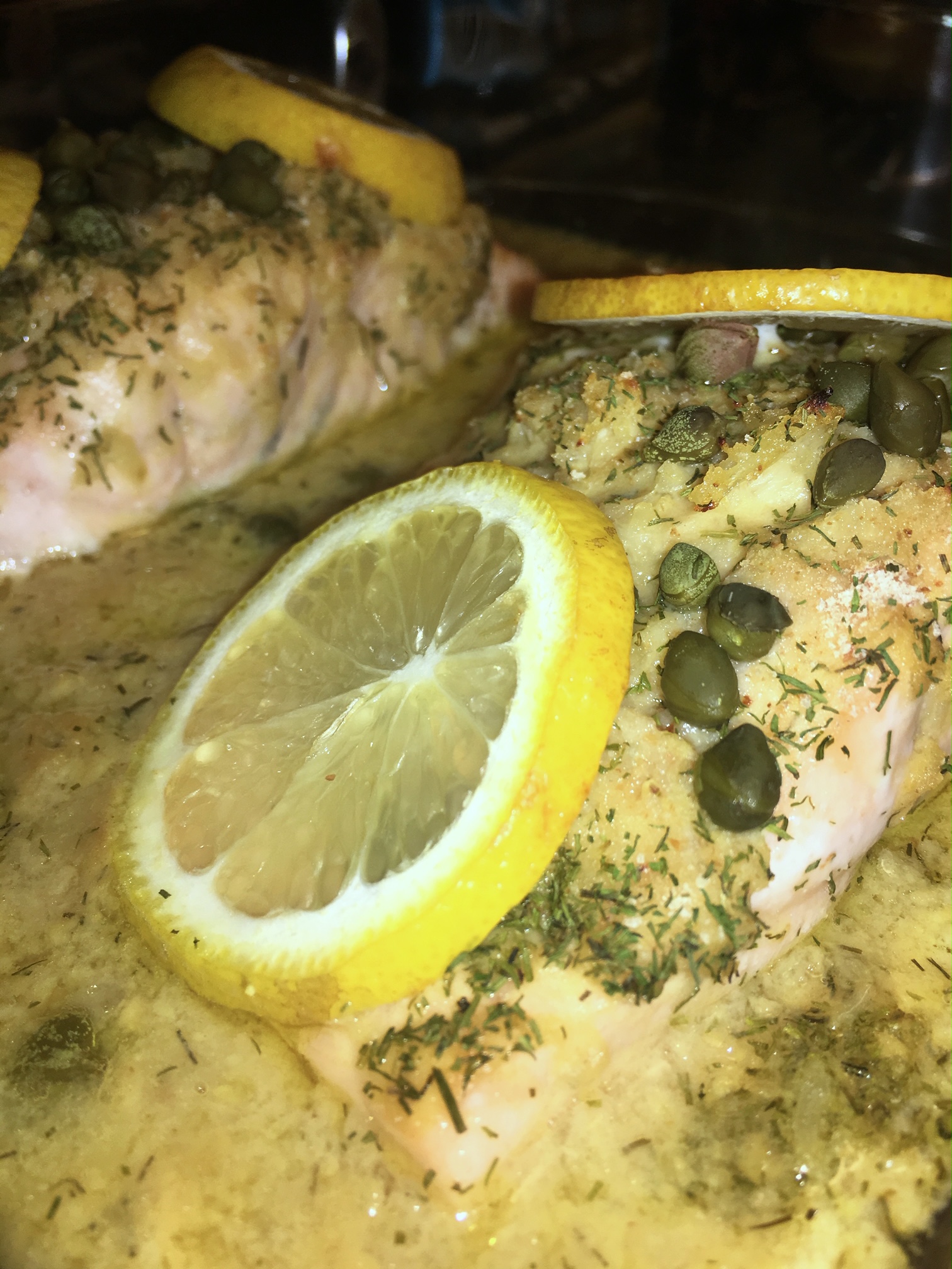 - After 15 minutes of cooking, remove dish from the oven. Place lemon slices over the salmon. Pour white wine around the fish (not directly on top or you’ll wash off the sauce, and you do NOT want to lose that slight crust!) Sprinkle the capers judiciously over the salmon fillet. Return to oven for 7 minutes.
