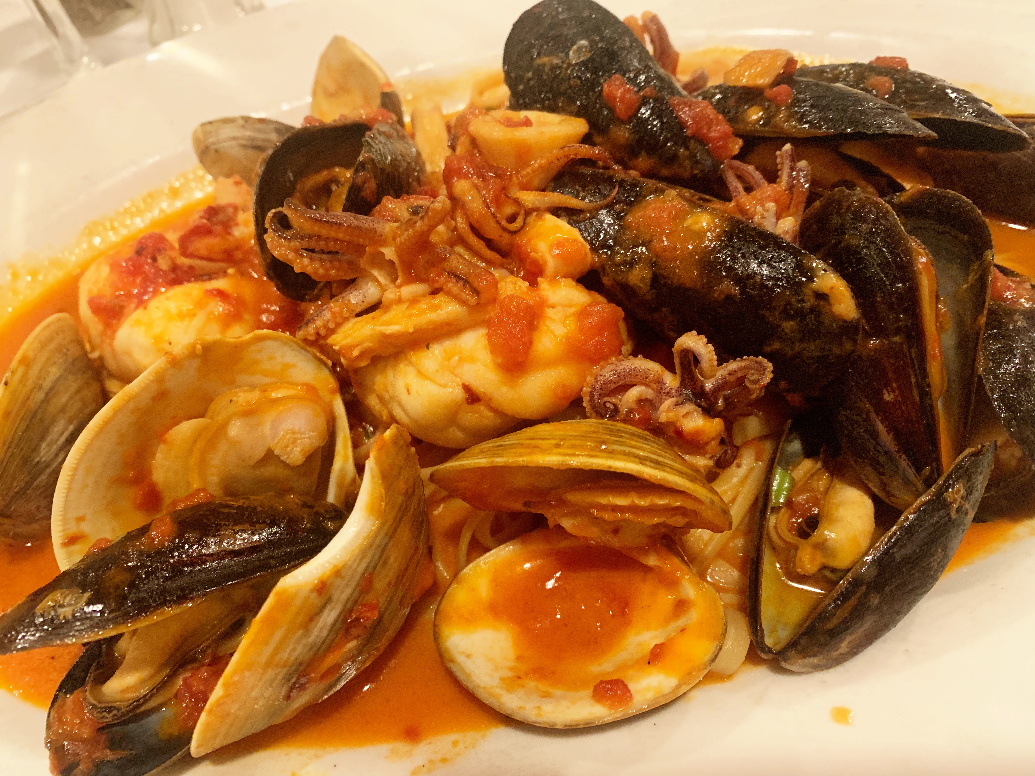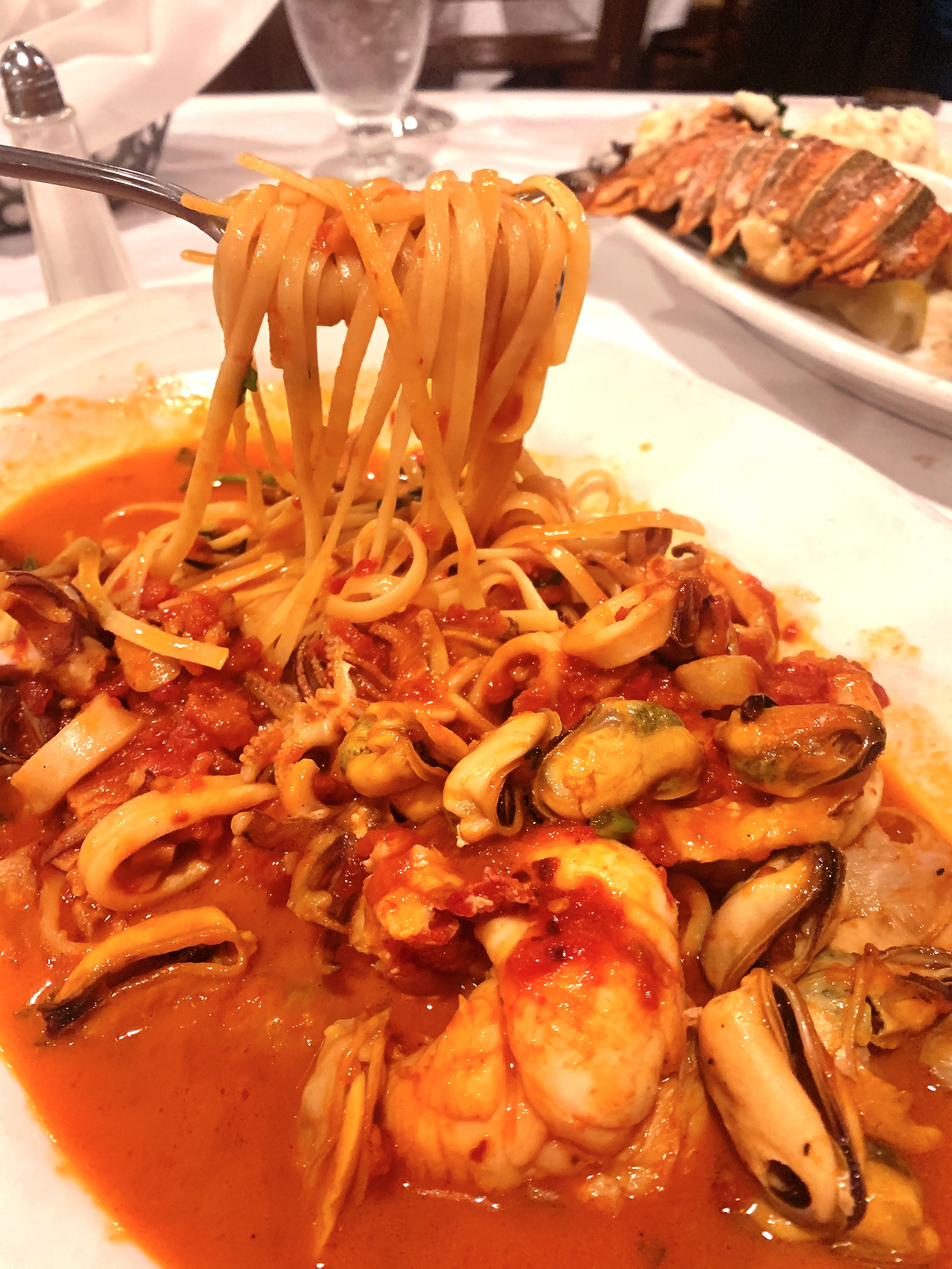 I am more decisive. Once I give myself a stern talking to about the pitfalls of ordering myself TWO entrees, I am firmly in camp Lobster as well. They up the ante on their regular menu offering of Frutti di Mare by adding lobster tail (which I had to make sure would be de-shelled for me, I can’t be wearing all that sauce by wrestling it off myself!) and my favorite sauce, Fra Diavlo. Put all my favorite offerings of the ocean in a spicy marinara and serve it up over linguine?? Happy Valentinesaversary to me!