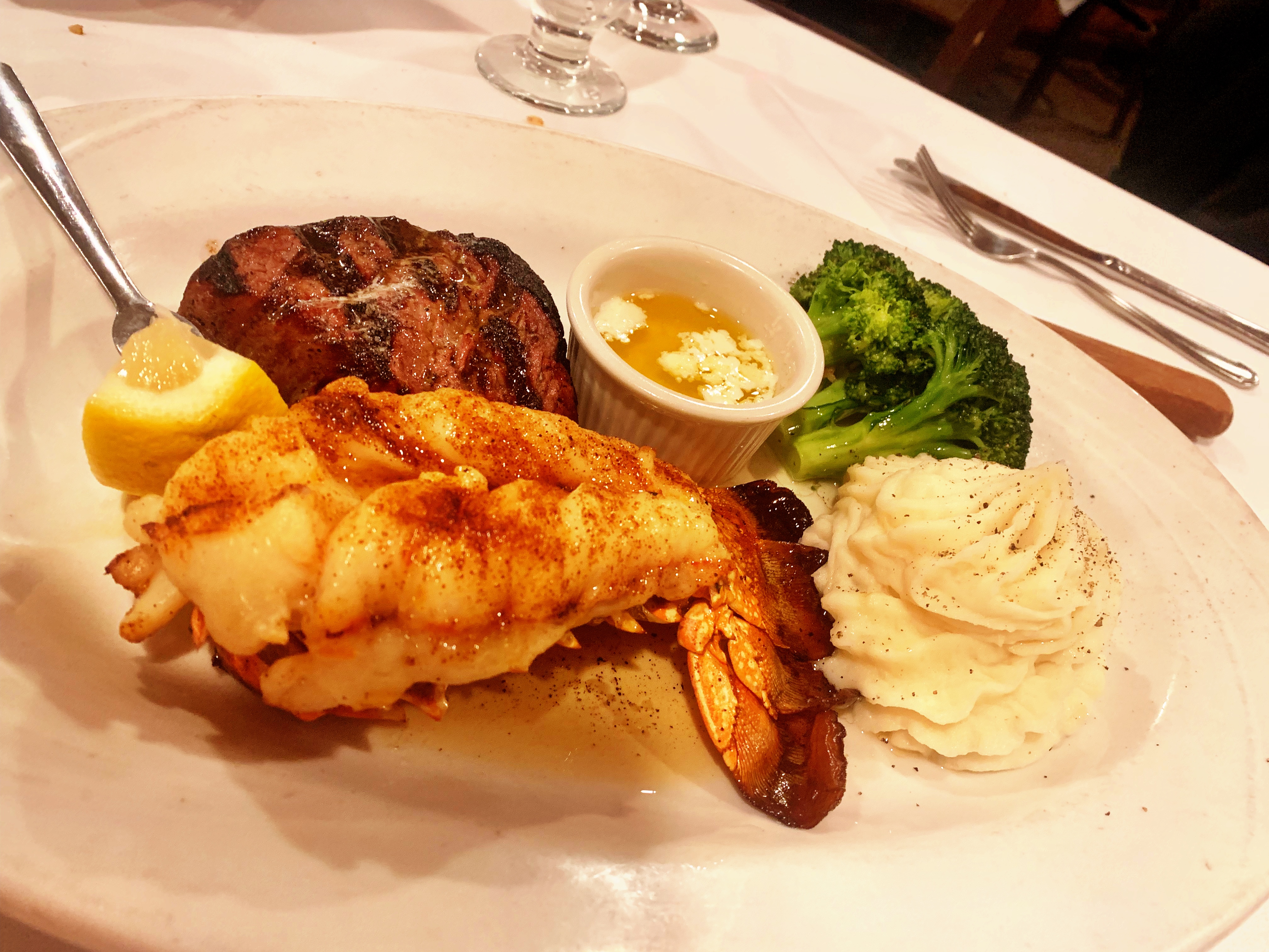 This time, it’s no contest between the menu and the specials; its two different specials that has him torn! Does he go with his lifetime favorite; surf and turf of Filet Mignon and Lobster Tail? Or the night’s most attractive entree (thank you to the table next to our for giving us a sneak peek, although I was strongly cautioned against taking a picture of THEIR food, psh) the Stuffed Veal Chops? As you can see, Surf and Turf won out, because LOBSTER…obviously.
