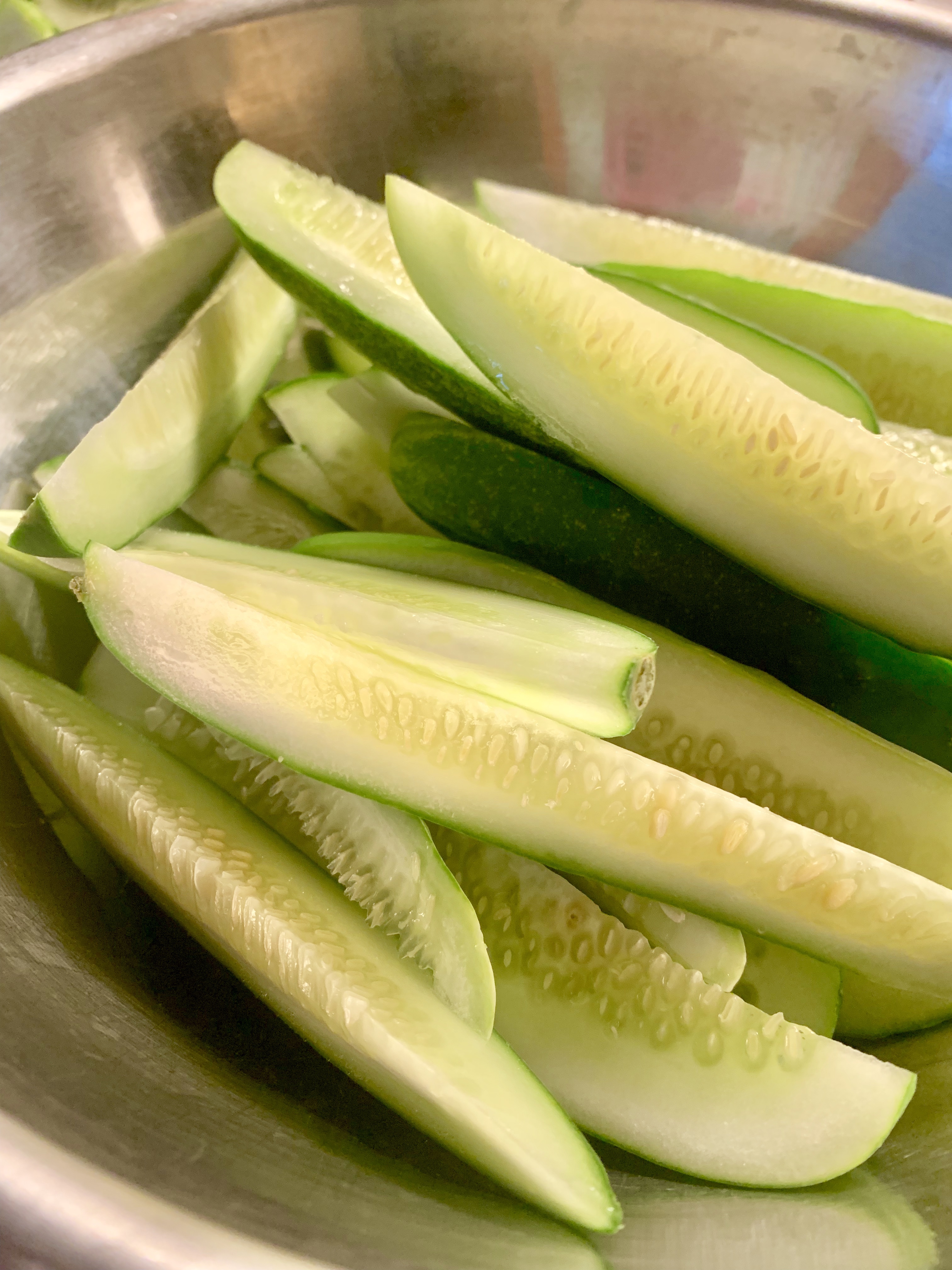 - Slice your cucumbers. I like to mix up chips and spears. The shorter (Kirby) cucumbers are best for spears, and the longer ones are best for chips. I ended up cutting 3 cucumbers into chips and 5 into spears.