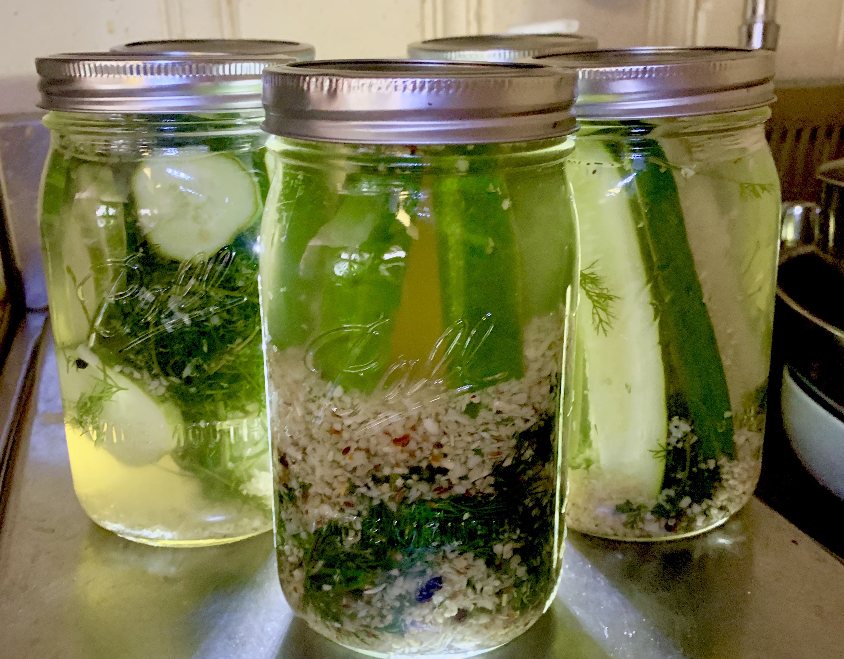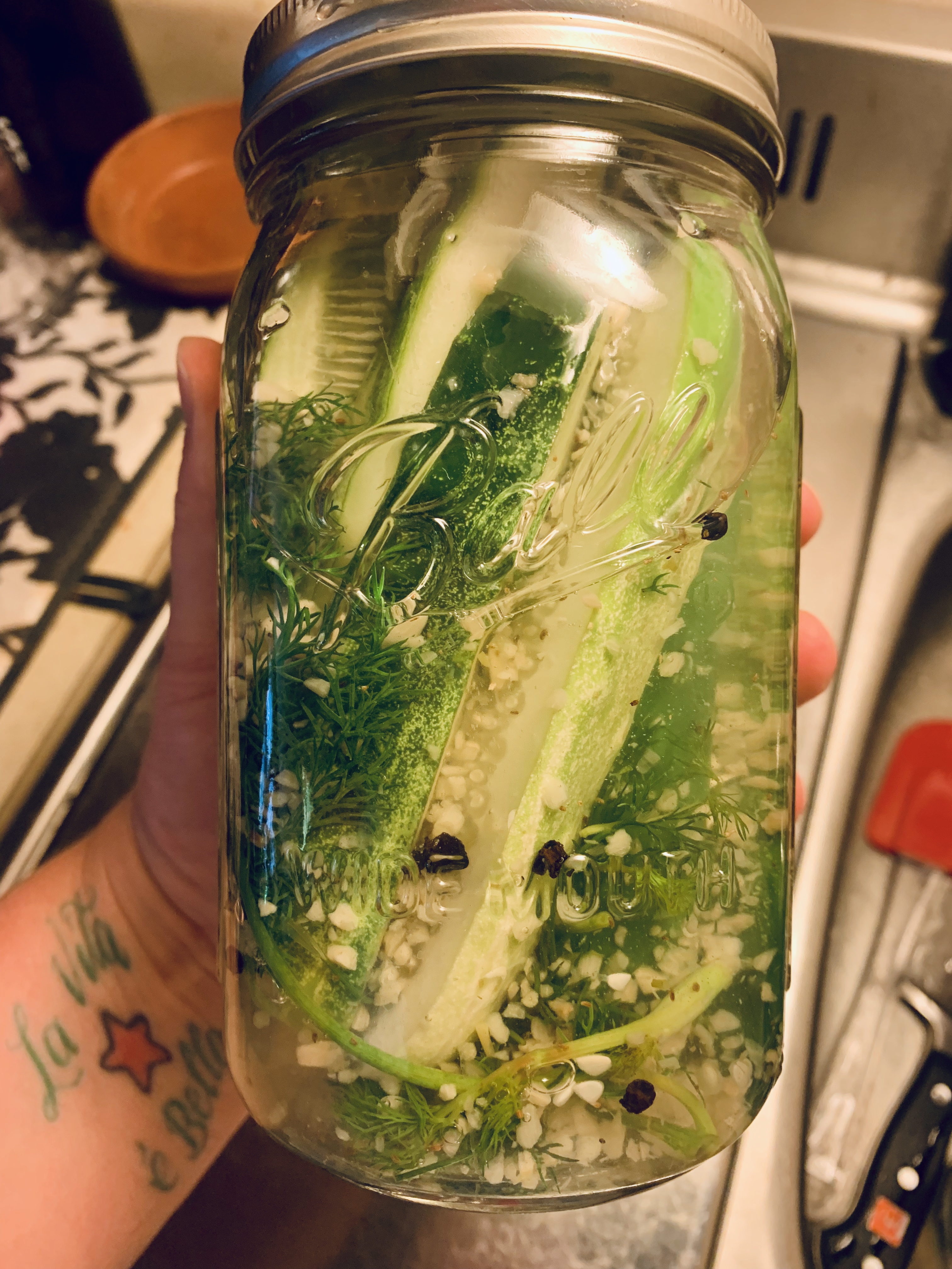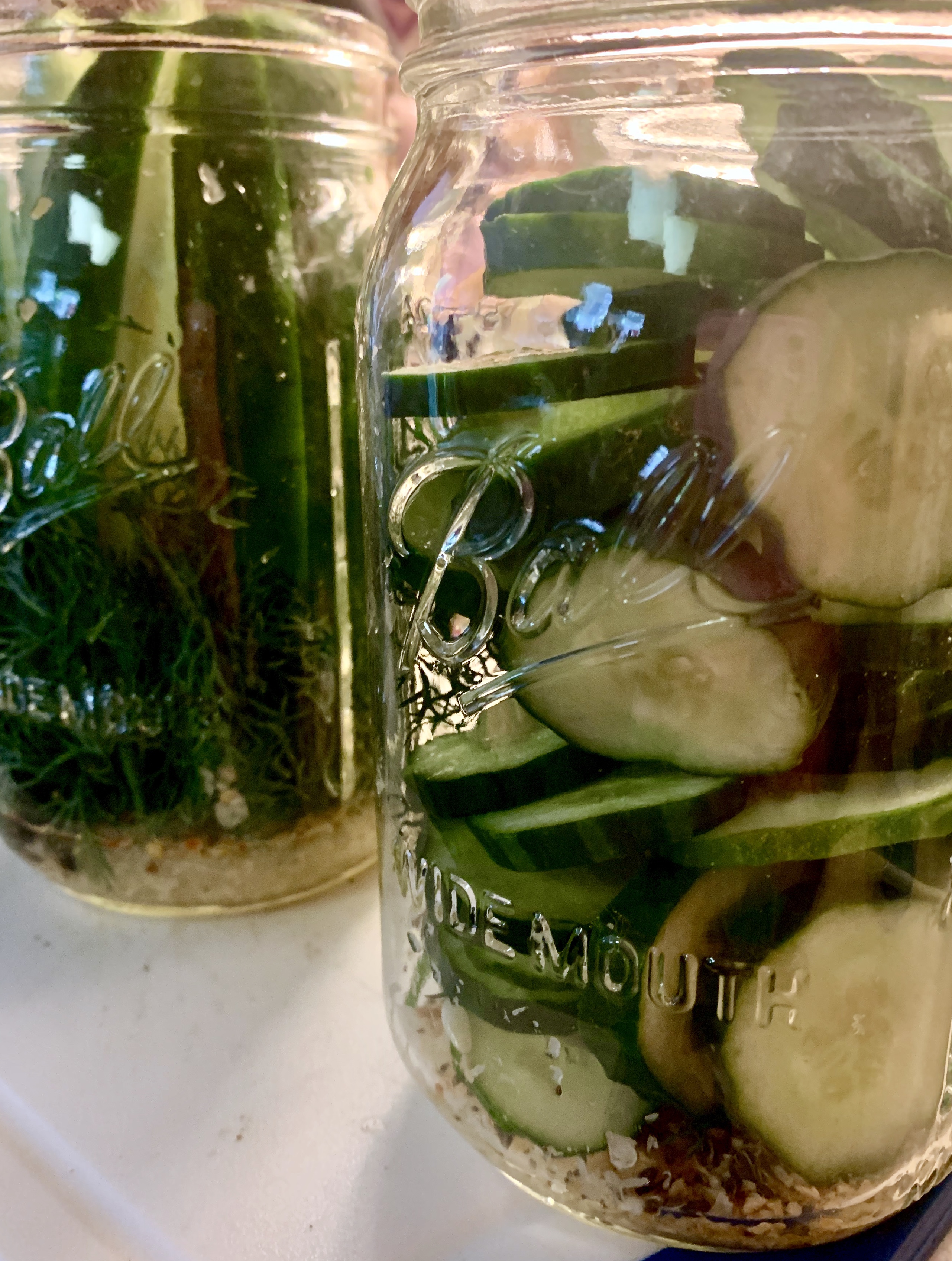 Enter the “ice box pickle”…Now I am a HUUUUUUUGE pickle person; I’ve been known to order sides of pickles in restaurants, ask for extra pickles on my burgers, and you know I will ask you if you’re going to be eating the one that comes on your plate, because if you aren’t…send it my way! So my thoughts after the first round of harvest led to a week of salads, was to make these babies into delightfully DILL-icious pickles.