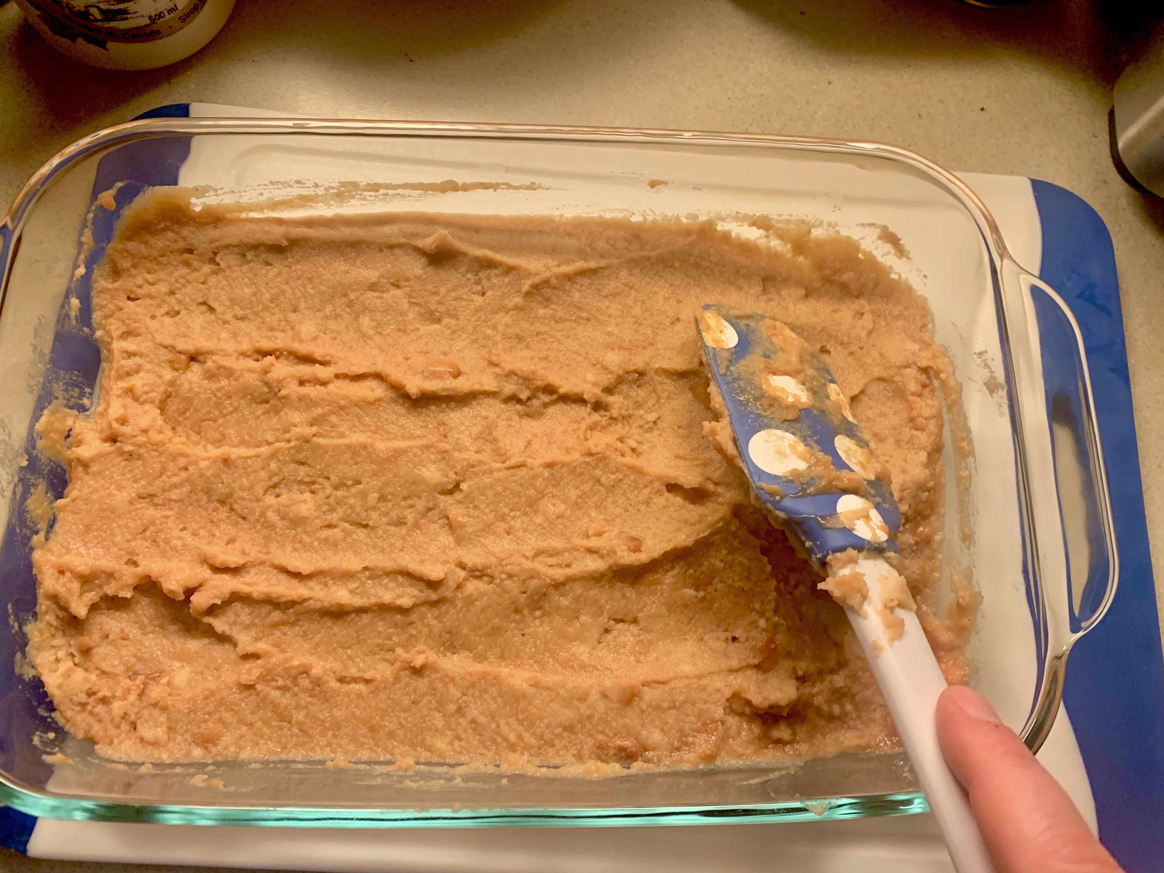 - Scoop out refried beans from the can into the bottom of your baking dish and mix with red taco sauce. Spread evenly.