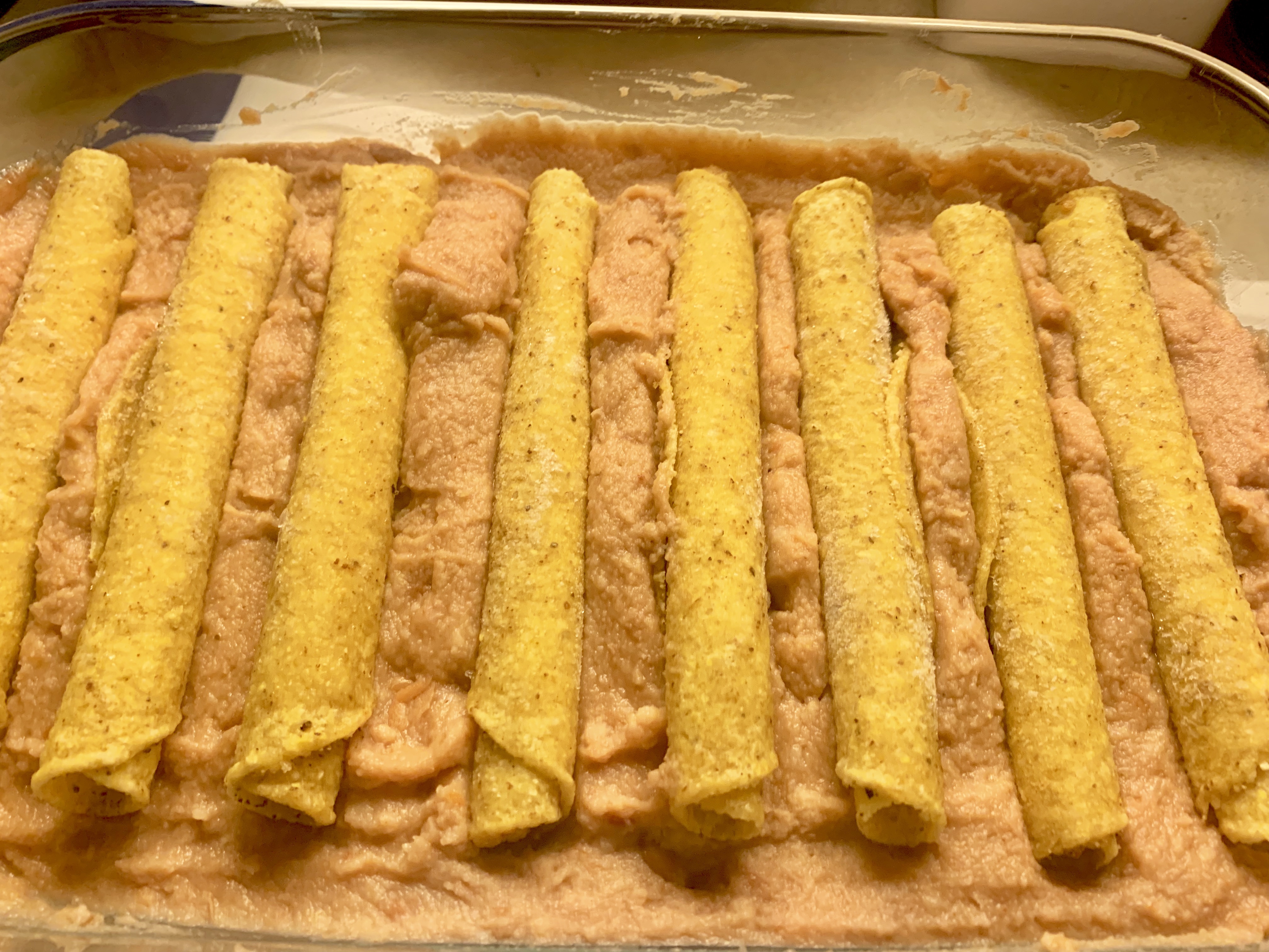 - Line up your taquitos on top of the refried beans; push them in to fit a single layer.