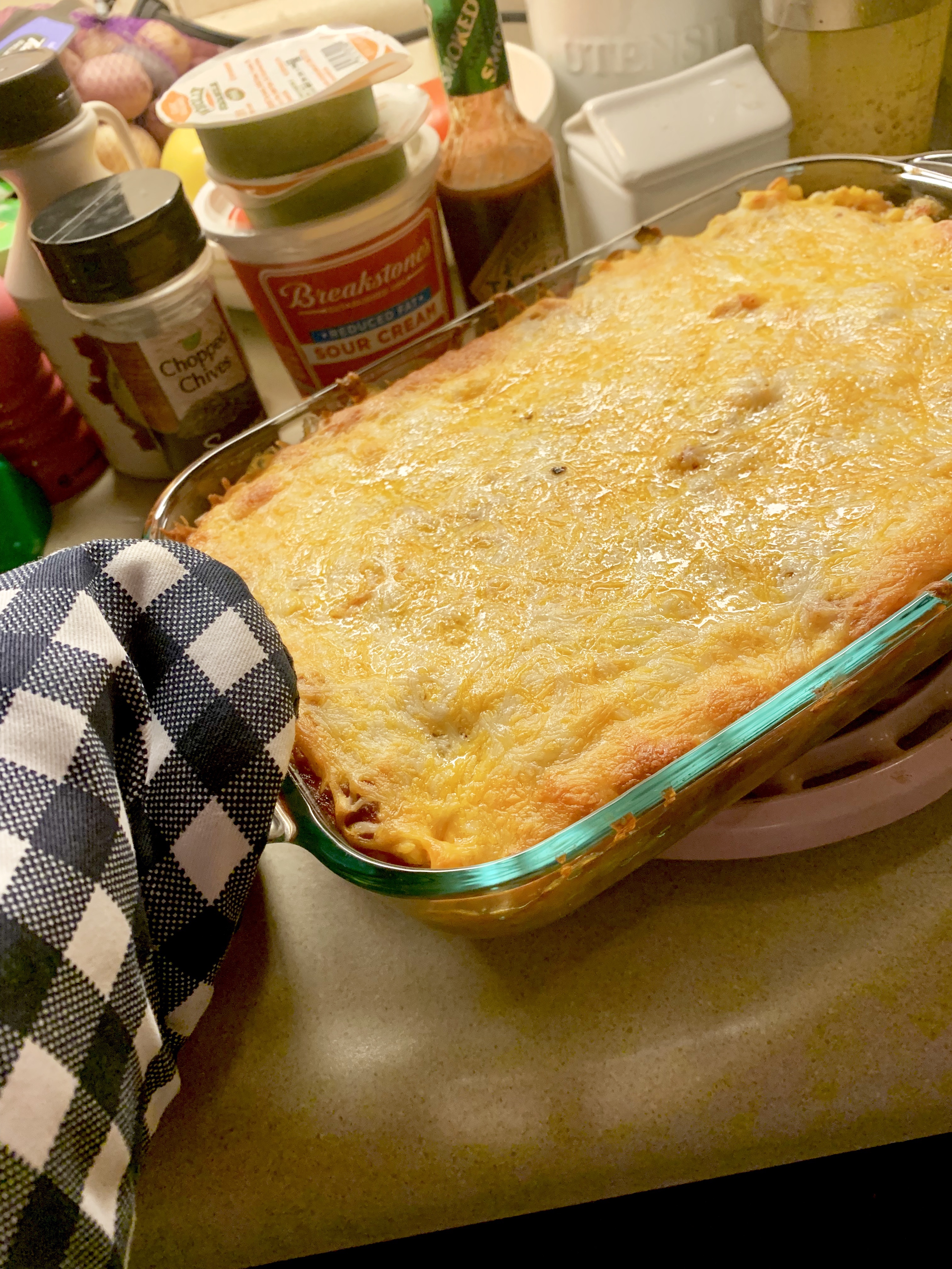 **Note: if you prefer your taquitos to have a bit of crunch, you will want to fry them prior to putting them into the casserole. This will of course, add more time an effort on your part, and for me, it wasn’t happening.