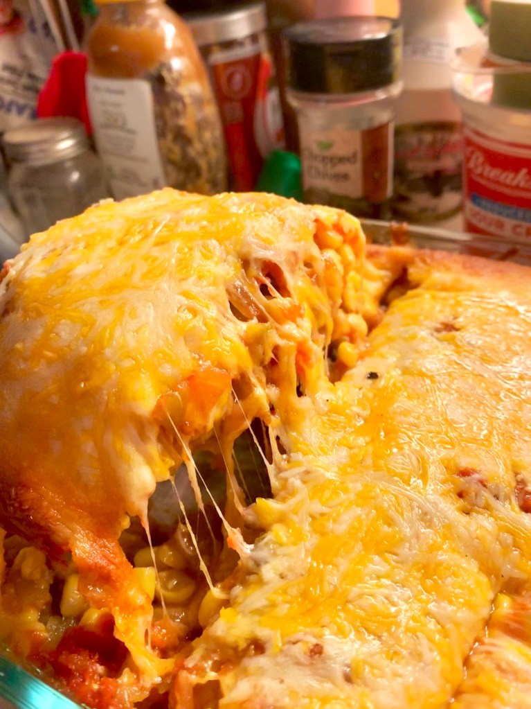 You know I love me some tacos, no matter what day of the week it is, and this just seemed like a face-palm duh, why not turn my frozen aisle go-to into a Mexican rollatini style casserole? Literally every part of this is pre-made, although for those who have this thing called “time” on your hands, feel free to make from scratch, and it comes together quickly and easily for a cheesy goodness dinnertime win that no one will be able to say anything but “gracias” to.