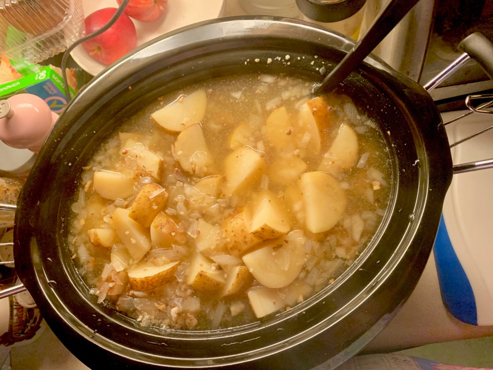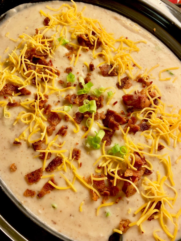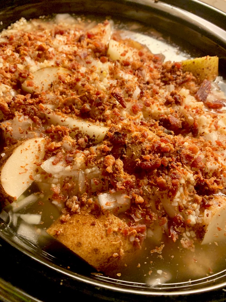 - Add potatoes, onion, garlic, seasoning, Bacon bits, and chicken stock to slow cooker. In my 7 qt crock, it’s a TIGHT squeeze, so if you don’t have a large one, you may want to halve this recipe.