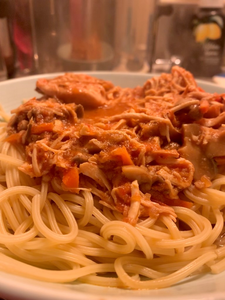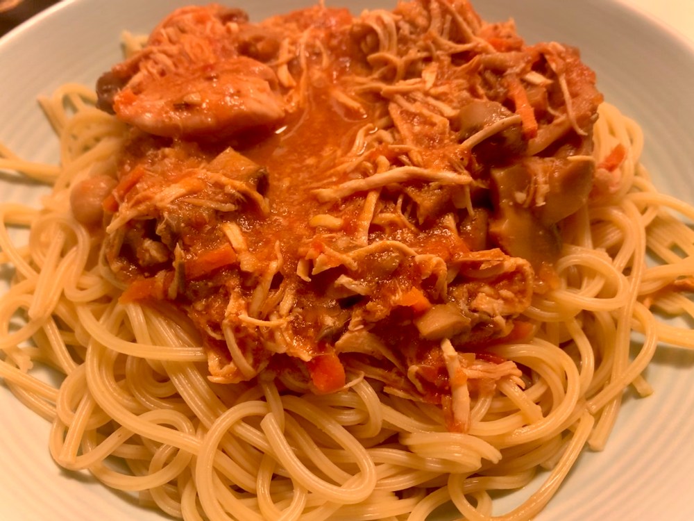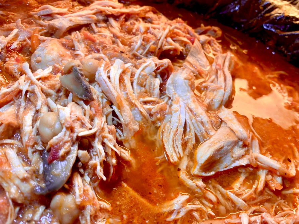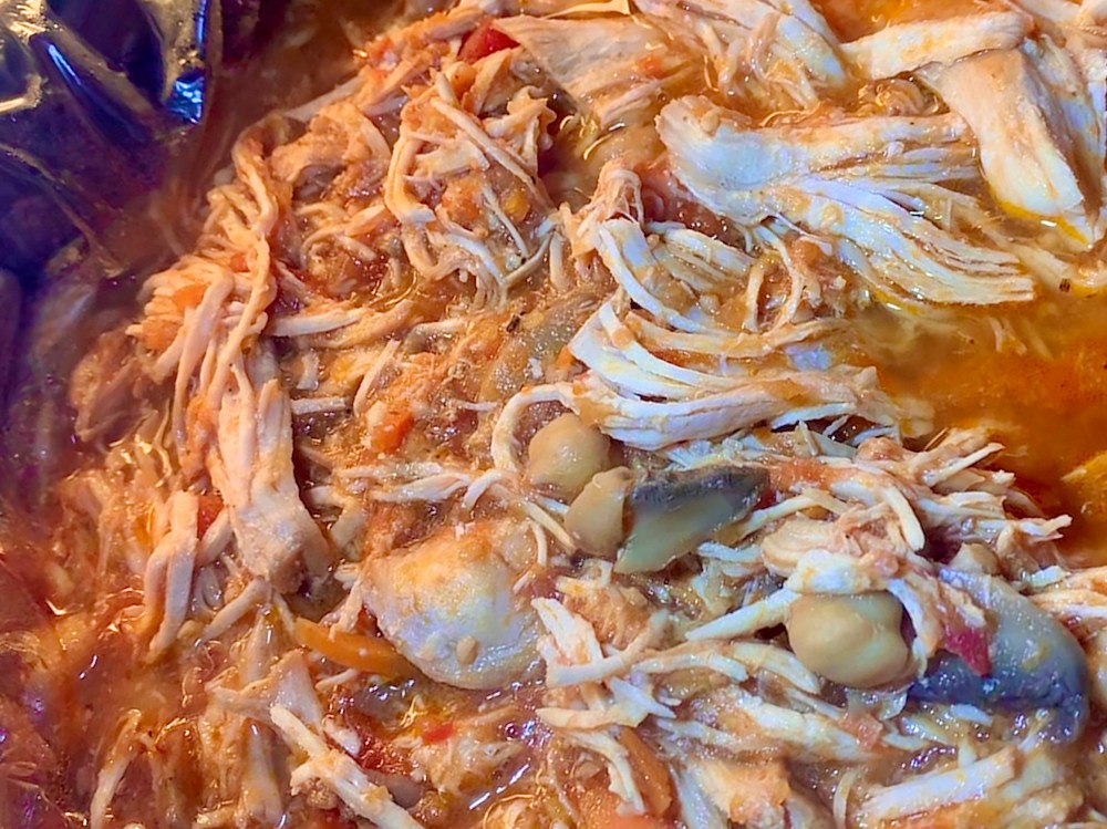 - When finished cooking, remove the chicken to a plate and shred. Return shredded chicken to the crock and let it “steep” while you boil up your pasta or rice.