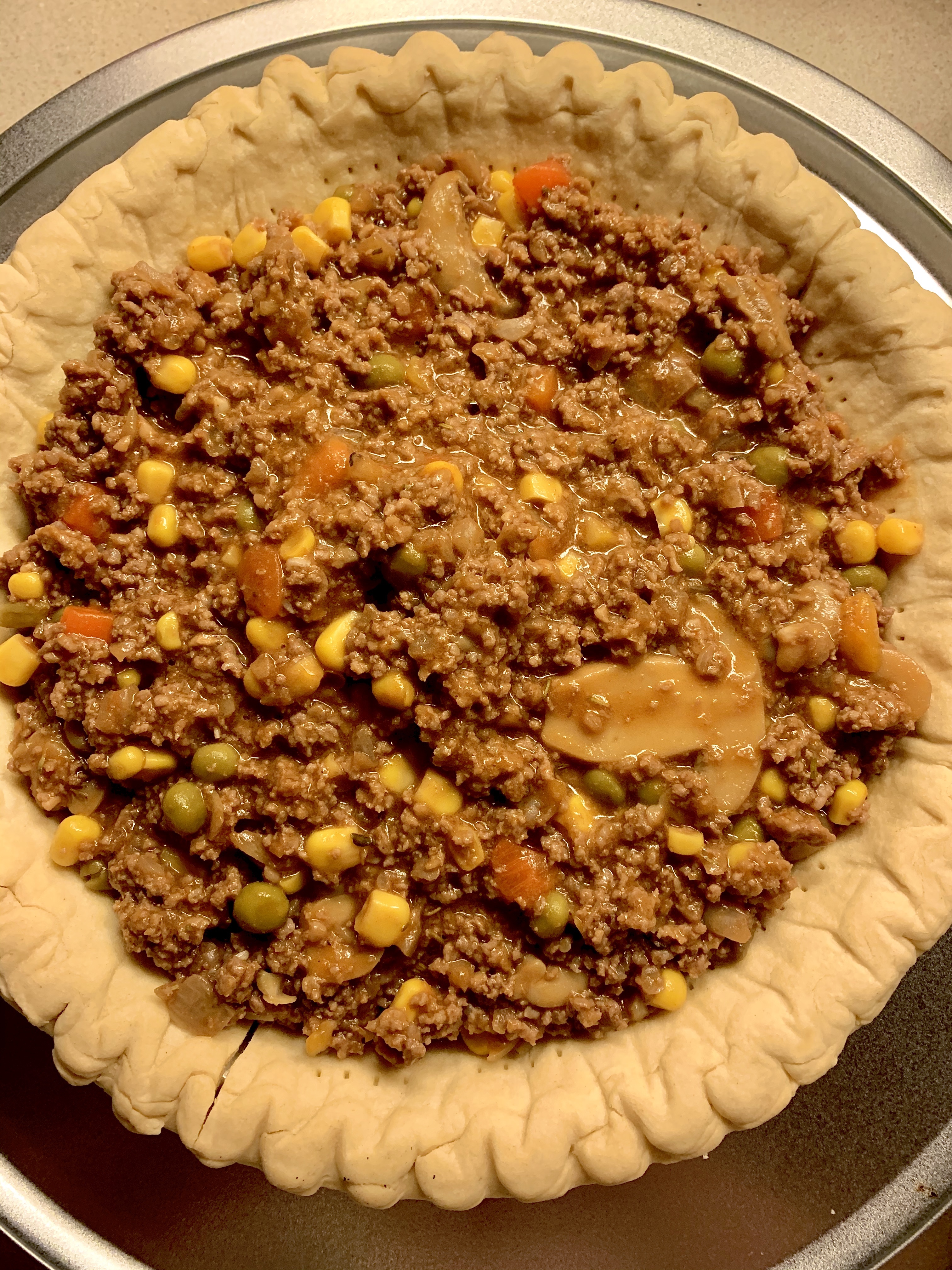 - Add meat and vegetables to the pie crust. Let cool slightly, about 8-10 minutes; it will make it easier to spread your mashed potatoes!