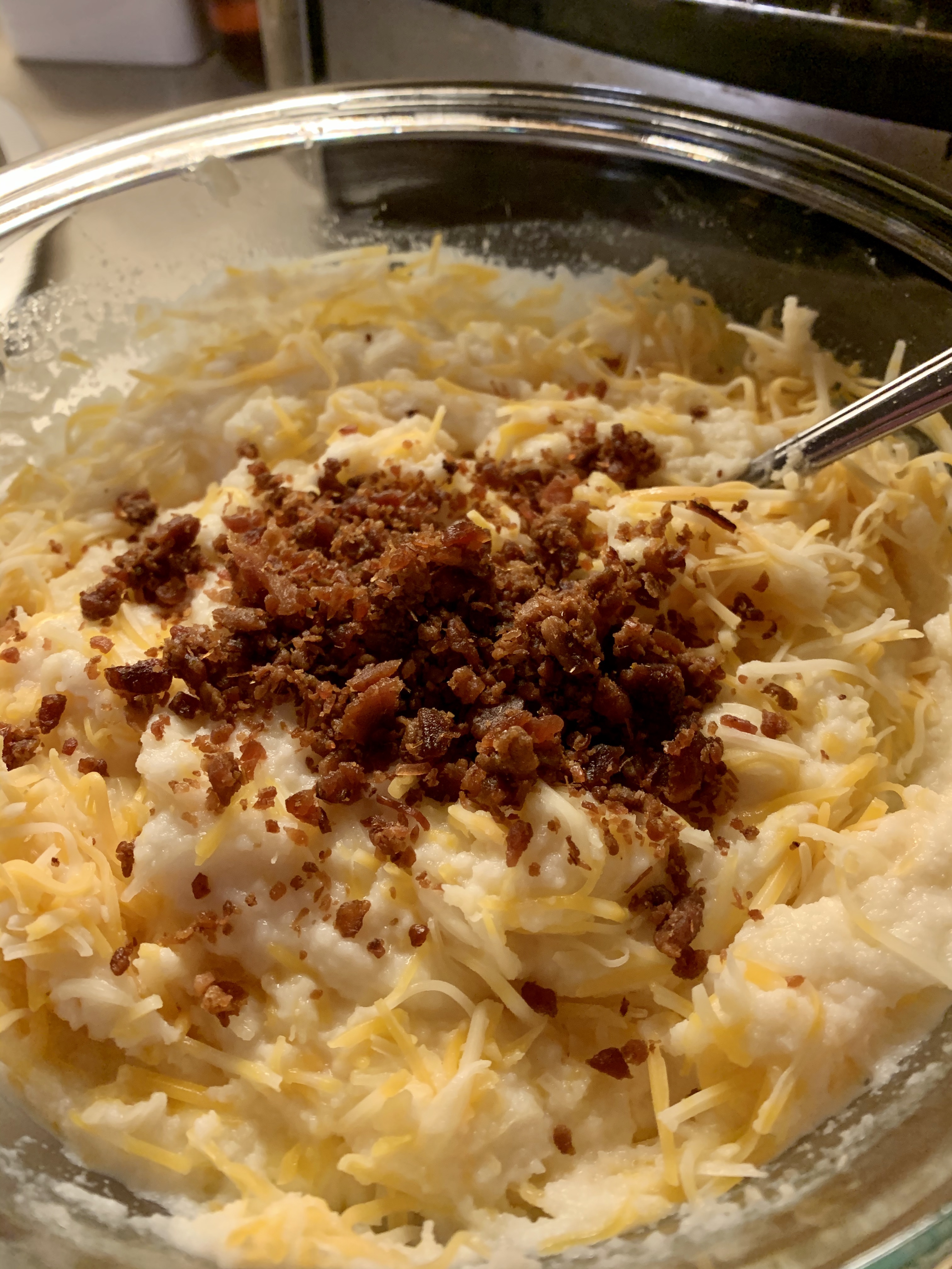 - Add shredded cheese and bacon bits to pre-made mashed potatoes. Top the meat and veggies with the mashed potatoes, and try to smooth out as evenly as possible. Sprinkle extra cheese on top if you’re feeling it.