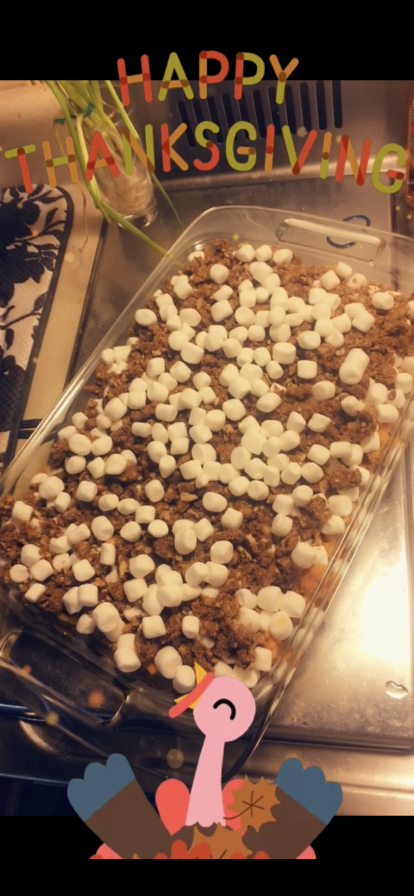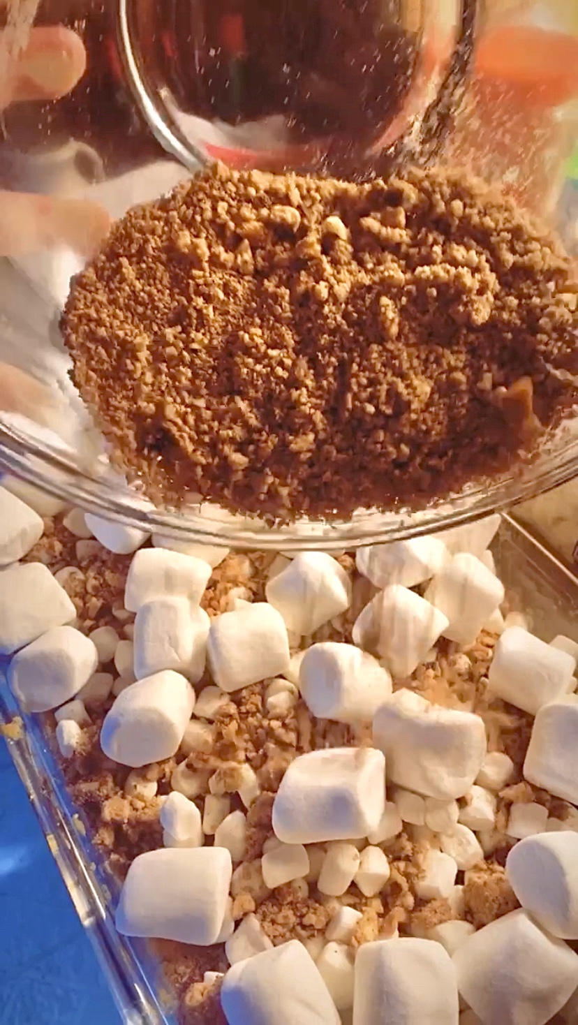 - Remove the casserole dish from the oven. Top with half the marshmallows, then sprinkle half the streusel over the marshmallows (pinching pieces together with your fingers). Top with the other half of the marshmallows and sprinkle the remaining streusel over the top.