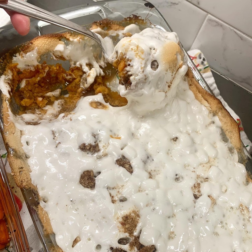 OK so can this be made in advance you ask? Of course! I have to travel with these for my Thanksgiving celebrations, so what I do is prepare the yams and heat them through (just to get those flavors all mixed). Then I prepare the streusel topping and blend with the marshmallows and pack that mix into a container that will travel with me. Once at my destination, I add the toppings, and put it into the oven for about 15 minutes which allows it to get warmed up again AND gives some nice color to the marshmallows and streusel.