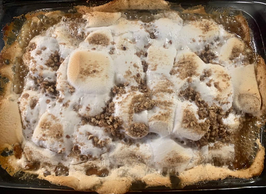 - Place back into the oven for 8-15 minutes, until the topping is bubbly and golden brown (keep an eye on it so the marshmallows don’t burn). You can also place it under the broiler very briefly to add a little more color to the marshmallows. Note: the longer it is in the oven the more likely that the marshmallows will begin to melt.