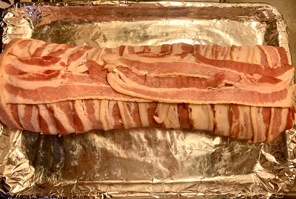 - Fold pork back up so that cream cheese is enveloped and wrap tenderloin with bacon. Use the extra two pieces of bacon to cover the seam where the ends meet in the middle.