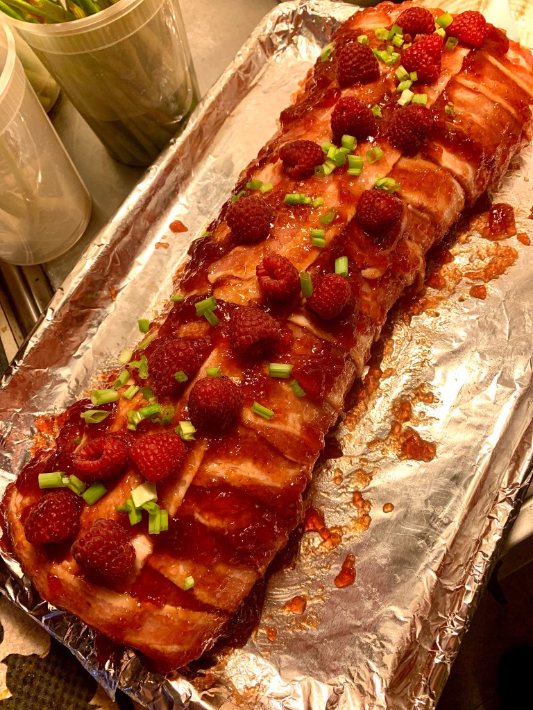 - Baste entire bacon-wrapped tenderloin with enough raspberry chipotle sauce to cover but not so much that it drips excessively onto the cookie sheet. Top with remaining raspberries and more sliced scallions.