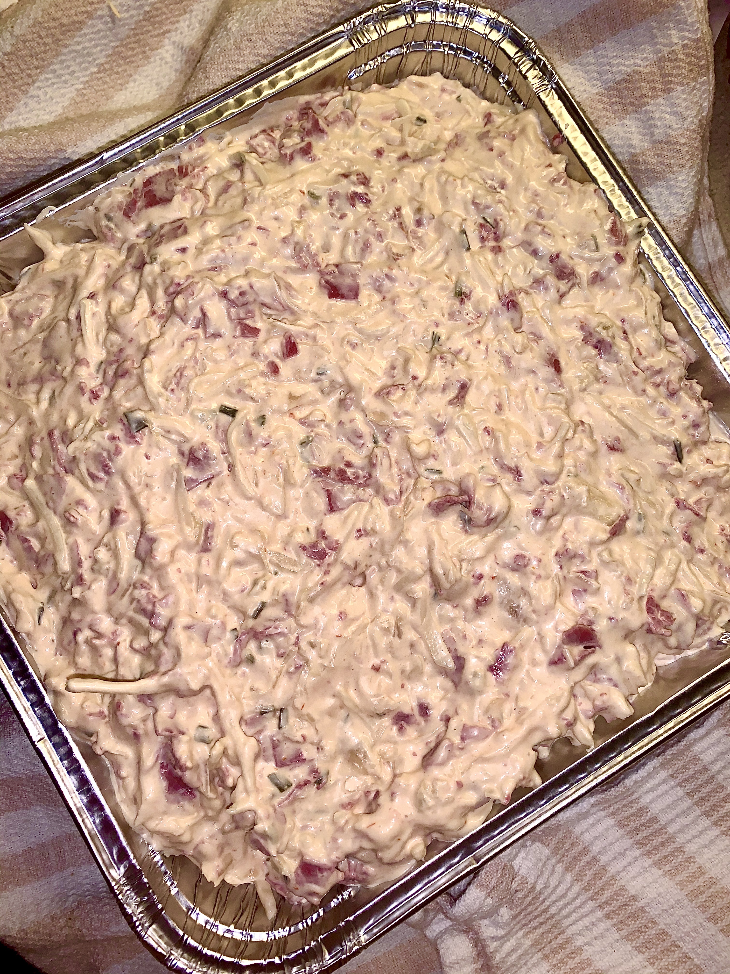 - Squeeze all excess moisture from sauerkraut (very important or you’ll have runny dip!). Add to the bowl with corned beef and 1 ½ cups cheese. Mix by hand until combined.