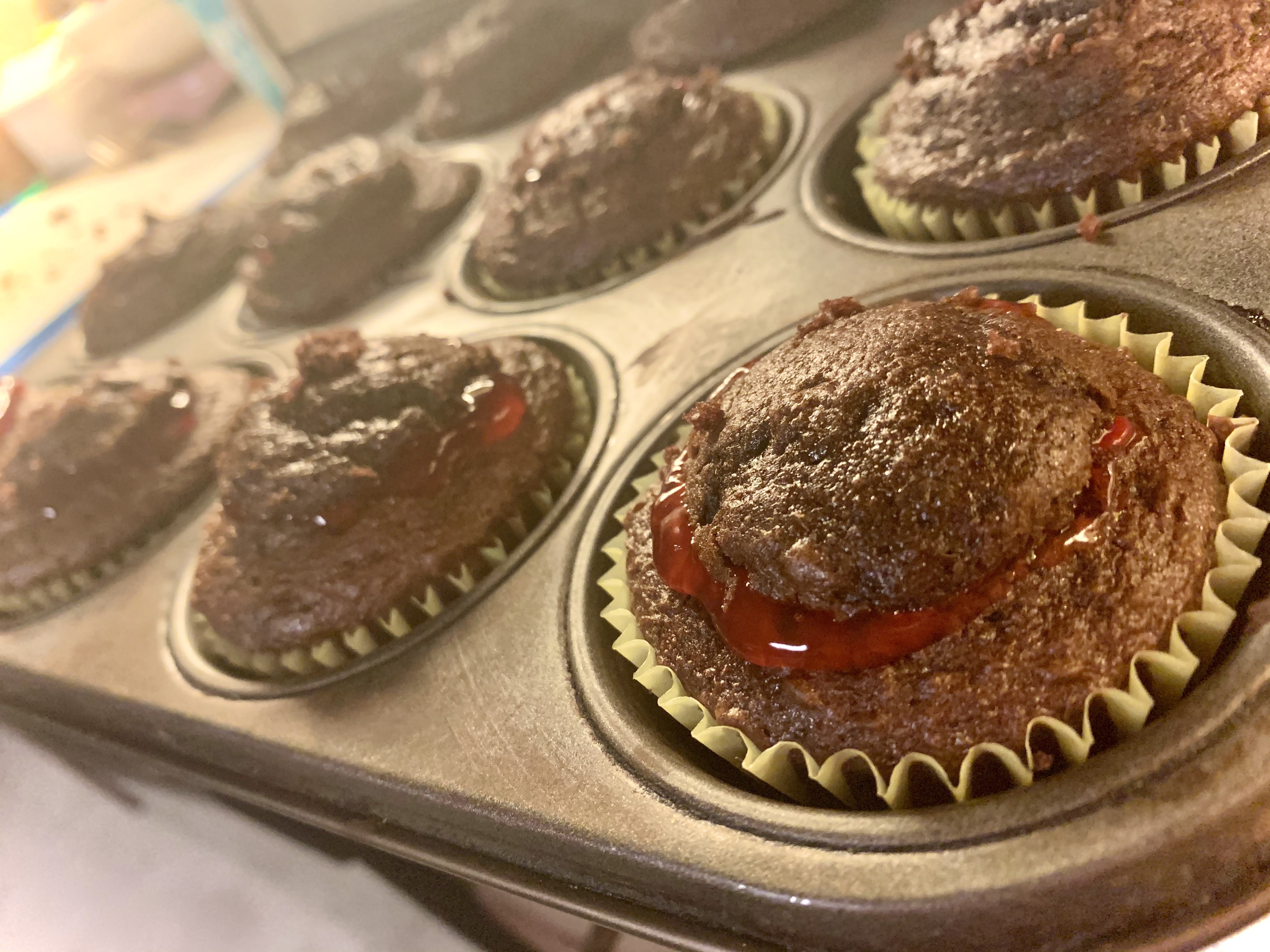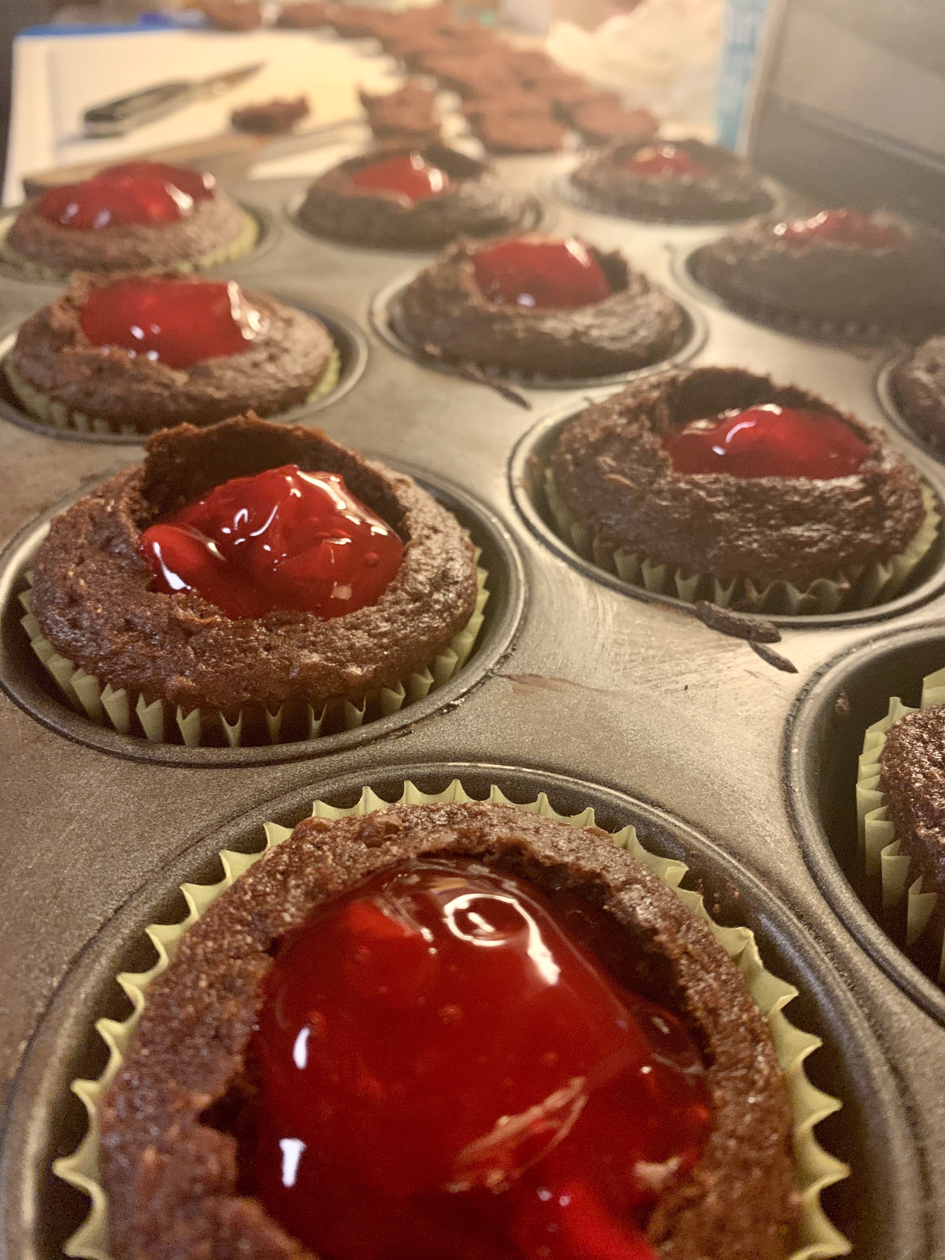 - Scoop about 1-1.5 tablespoons of the cherry filling into each cupcake, and recover with the top you cut out.