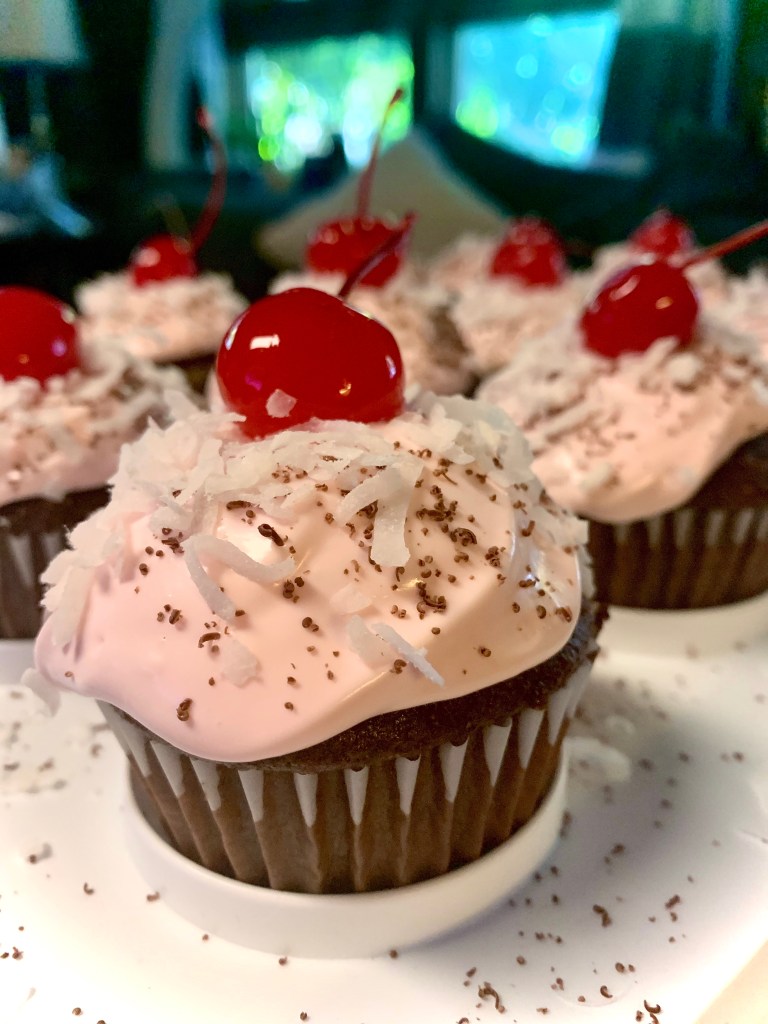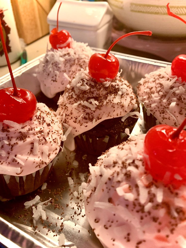 - Combine your frosting with the container of Cool Whip, and scoop mixture into a frosting bag (or a ziplock baggie if you don’t have a designated frosting bag). Then pipe the frosting on top. Garnish with chocolate shavings, coconut and a cherry on top! *NOTE* this icing is a bit runny due to the cool whip, you may want to refrigerate the icing mix prior to piping into the cupcakes if you want precise frosting.