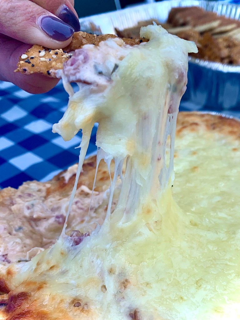 - Bake for 30 minutes or until bubbly and golden. Garnish with chopped chives. Serve immediately. **NOTE** This dip can be assembled the night before, so all you’d have to do when ready to serve is heat up the oven and cook!